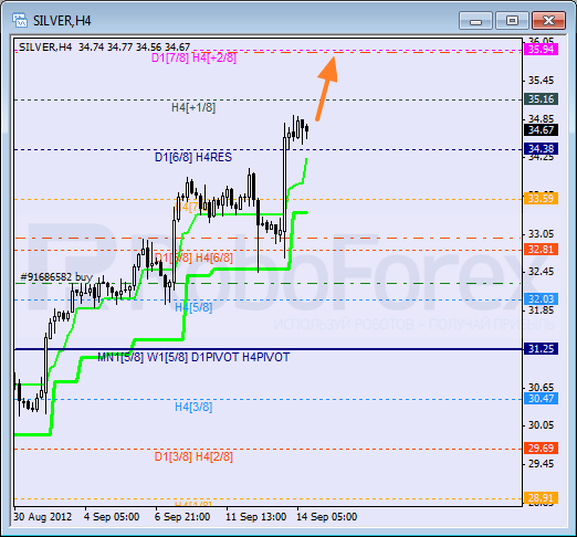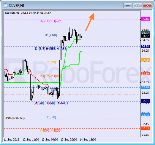 Yesterday, after being supported by the 6/8 level, Silver started growing up. At the moment the price is consolidating inside an “overbought zone”. The closest target is the +2/8 level. If the instrument breaks it, the lines at the chart will be redrawn.
