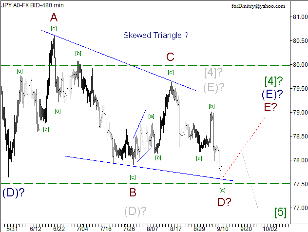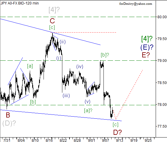 It looks like the price is completing wave D of (E) of [4], we can expect a final wave E of (E) of [4] of skewed triangle (E) of [4] and of horizontal triangle [4].